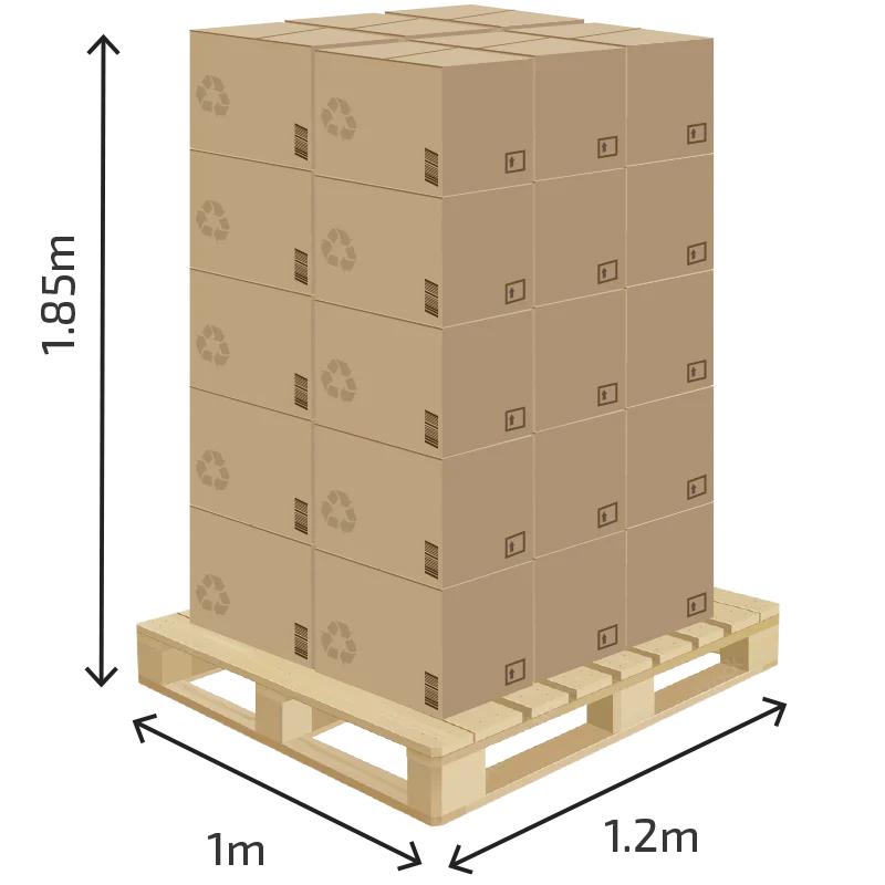 - Pallet: 1 x 1.2 x 1.9 mts; 30 cajas / pallet